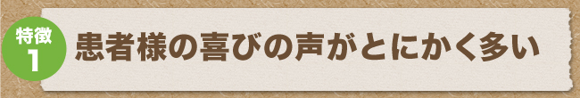 患者様の喜びの声=治療家の技術力+対応(接遇)と当院は考えておりますのでより多くの喜びの声を頂けるように日々試行錯誤し、患者様にとって最良の医療とは何かを研究しているのが当院の大きな特徴の一つです。